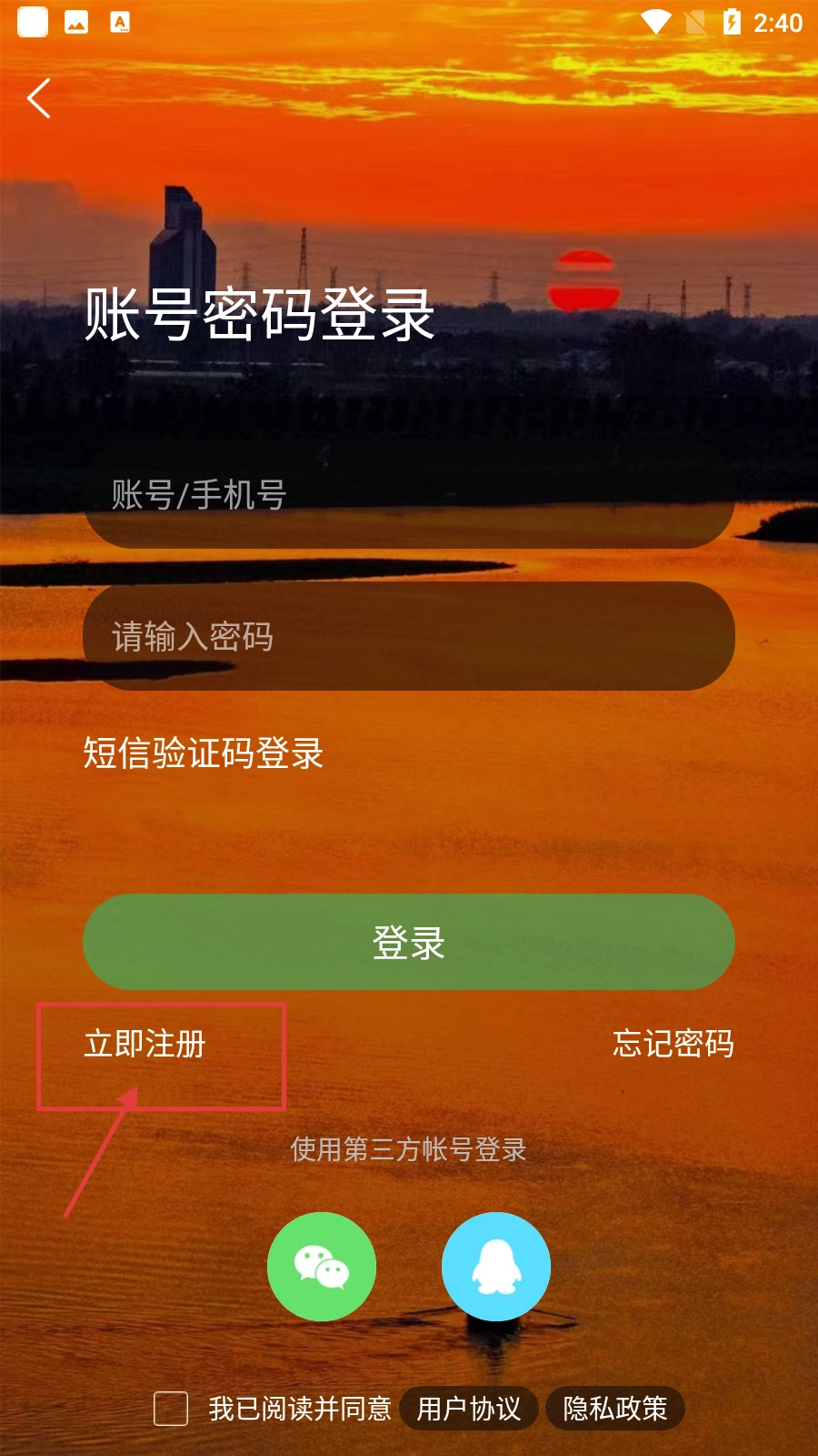 3、登录界面提供账号密码登录和短信验证码登录两种方式,若没有账号可点击“立即注册”。