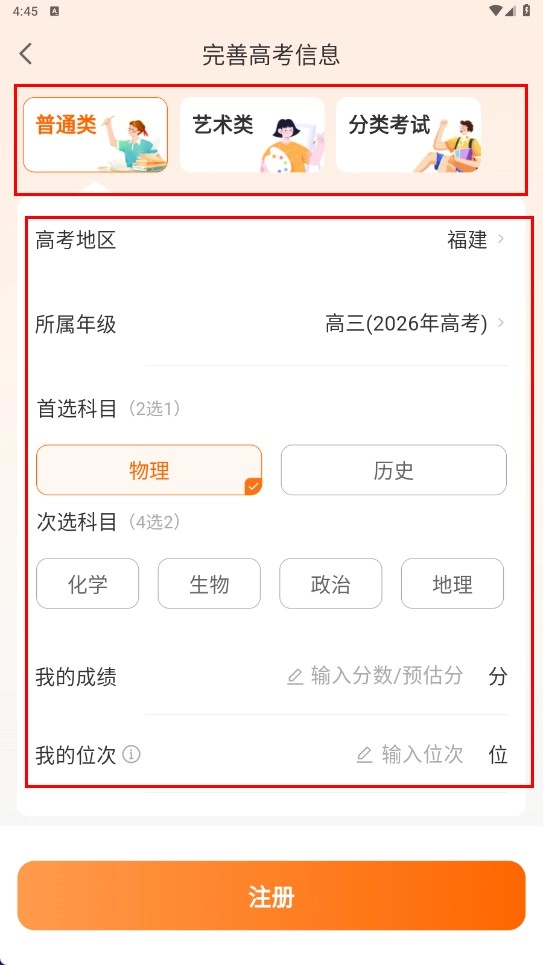 1、在完善高考信息页面,选择考试类型、地区、年级、选科等信息后点击注册。
