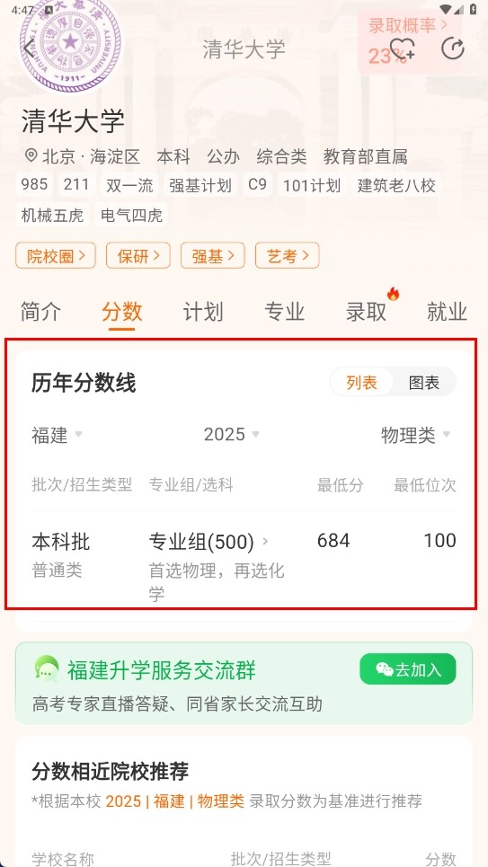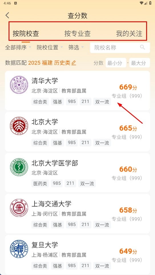 3、在查分数页面,可按院校、专业或关注内容查看院校分数信息,如清华大学分数。