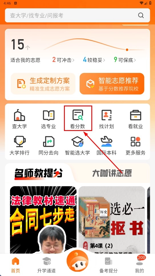 2、进入首页后,点击【看分数-功能图标】,进入查分数页面。