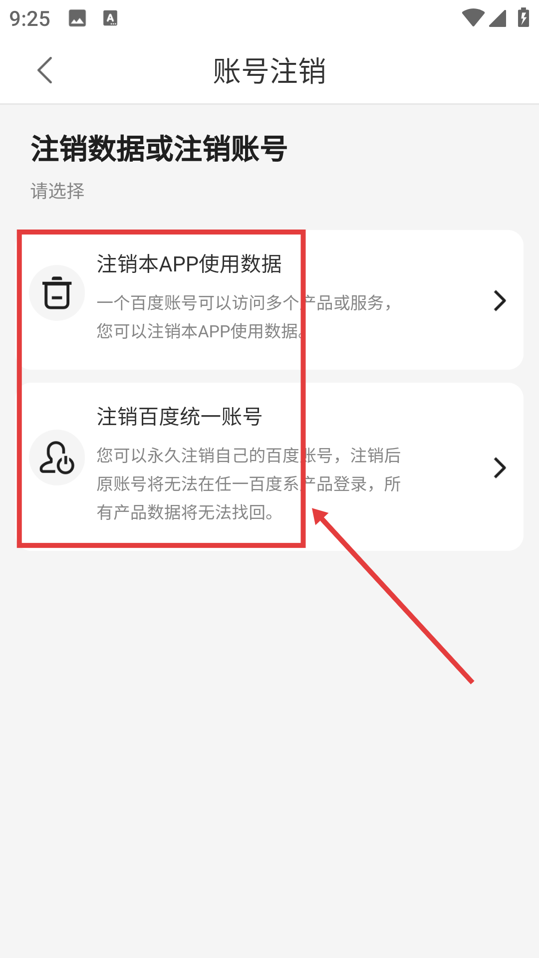 4、进入账号注销页面后,选择【注销本使用数据】或者【注销百度统一账号】这两个选项中的一个,然后完成账号注销的相关操作。