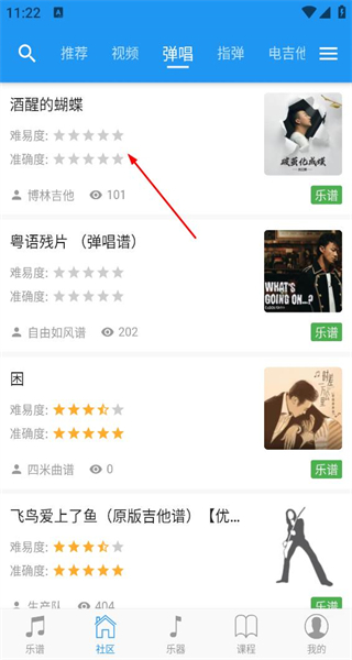 2、进入弹唱分类页面后,查看各吉他谱的难度评级与准确度星级,接着点击指弹标签,即可切换至该分类对应的内容展示页面。
