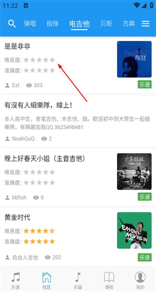 4、进入电吉他分类页面后,查看各内容对应的难度星级和准确度星级,并浏览该分类下与吉他相关的各类内容信息。