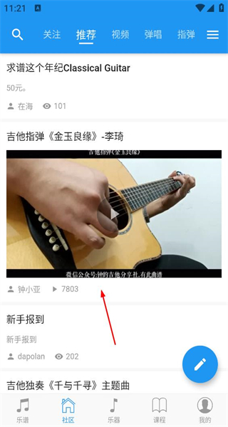 打开软件后,先进入推荐页面,浏览求谱信息和吉他指弹视频,然后点击弹唱标签,即可进入对应的内容分类页面。