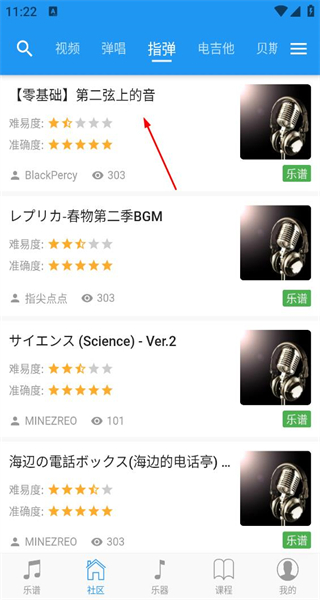 3、进入指弹分类页面,查看零基础教学等内容的星级,点击电吉他标签,切换到对应的分类内容页面。