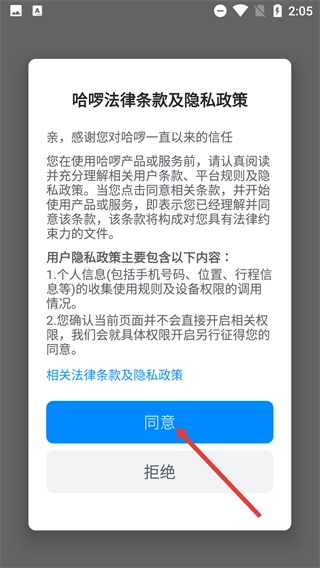 1、点击弹窗里的【同意】按钮,同意相关法律条款和隐私政策,就能继续使用哈啰的产品或服务了。