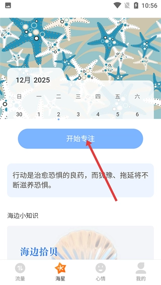 2、在海星页面点击【开始专注】按钮,进入专注计时的功能界面,开启专注相关流程。