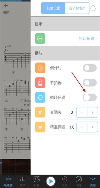 4、进入其他设置页面,查看显示播放类功能选项,可启用节拍器等功能辅助练习该吉他曲目。