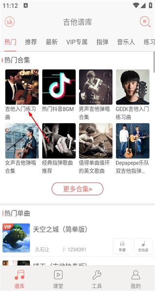 1、打开软件后,进入热门合集板块,选择吉他入门练习曲合集,点击进入该合集的详情页面。