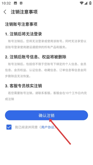4、进入注销注意事项页面后,仔细阅读并同意相关条款,随后点击【确认注销】按钮,即可完成账户注销流程。