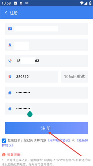 4、确认信息填写完整且勾选协议后,点击【注册】按钮,提交注册信息完成账号注册。