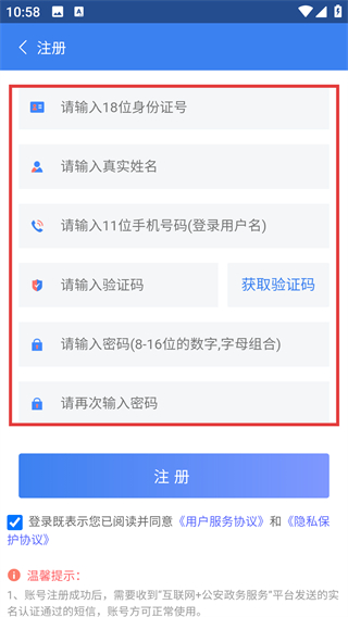 3、在注册界面依次填写【18位身份证号】【真实姓名】【11位手机号码】等信息,获取并填写验证码。