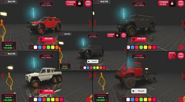 游戏里有不少 4×4 和 6×6 的越野车可供解锁,这些车型各有特点,有的适合爬坡,有的擅长穿越泥泞路段。