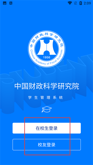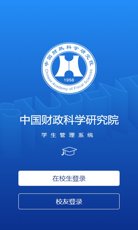 2、进入学生管理系统页面,系统归属【中国财政科学研究院】,可选择【在校生登录】或【校友登录】。