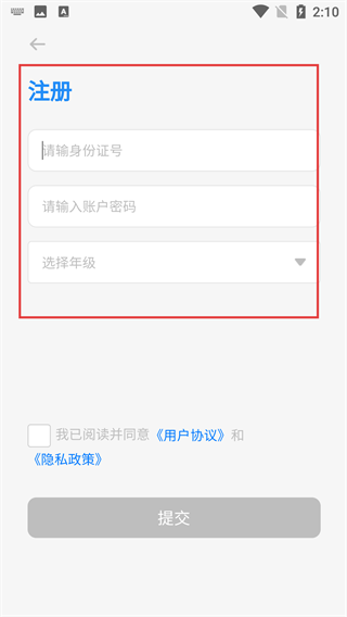 4、进入注册页面,需填写【请输入身份证号】、【请输入账户密码】,并选择【选择年级】来完善注册信息。