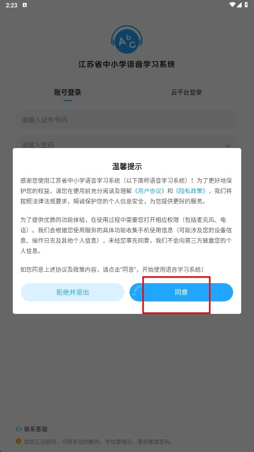 2、在温馨提示弹窗中,点击【同意】功能按钮,以继续进行登录操作。