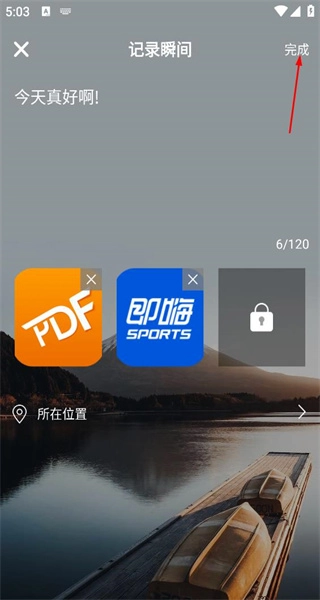 4、返回记录页面,输入文字并显示添加图标,右上角设完成按钮,指引指向该完成按钮。