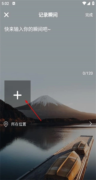 1、打开软件后,进入瞬间页面,展示已记录的生活内容,底部设加号按钮,指引指向该加号按钮。