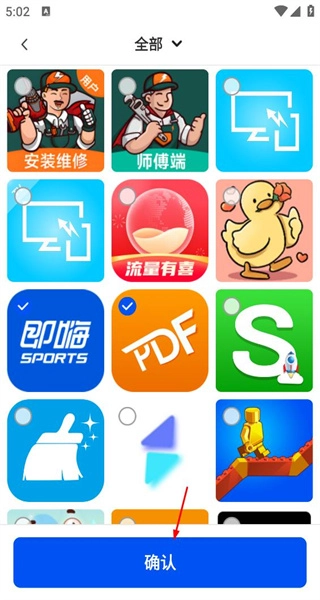 3、进入应用选择页面,展示多款应用图标,底部设确认按钮,指引指向该确认按钮。