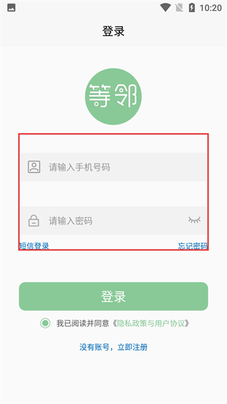 1、在登录的协议确认弹窗中,点击【同意】按钮,即可进入【等邻】的登录操作界面,若选【不同意】则无法继续使用软件。