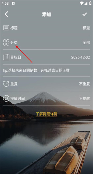 1、打开软件的添加页面,看到标题分类目标日等设置选项,点击分类选项准备选择对应的分类类型。