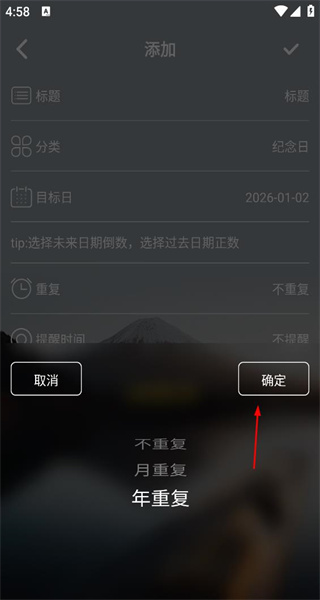 4、选择重复方式为年重复,确认各项配置内容无误后,点击确定按钮完成本次日程的添加操作。