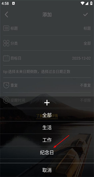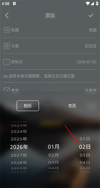 3、将分类设为纪念日,调整目标日的时间参数,把日期设置为2026年01月02日的阳历日期。