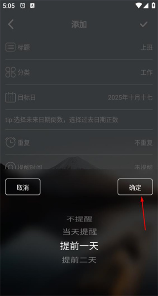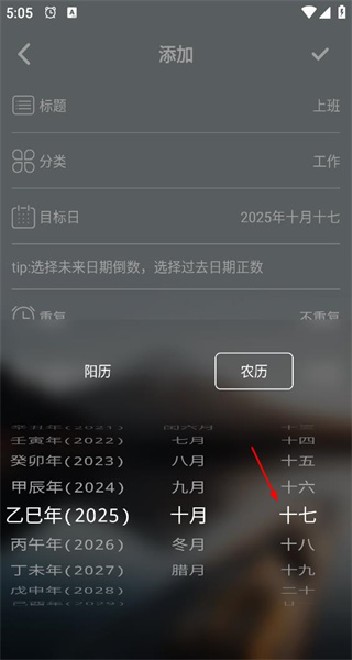 1、打开软件后,进入添加页面,填写标题为“上班”,分类选择“工作”,在目标日处切换到农历,选择乙巳年十月十七。