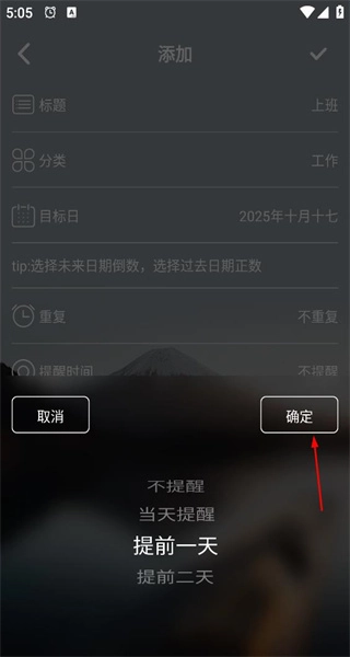 2、点击提醒时间后会弹出选项列表,从中选择“提前一天”这一选项,接着点击确定按钮,即可完成提醒时间的设置。