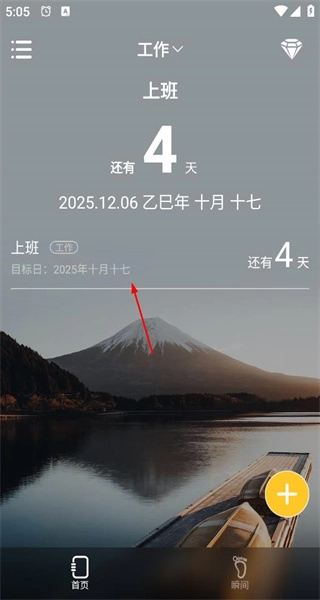 4、进入已保存事项的详情页面查看,能看到分类为“上班”的事项还剩4天,其目标日期是2025年10月17日的相关信息。