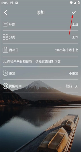 3、确认添加页面内标题、分类、目标日、提醒时间等信息后,点击页面右上角的对勾按钮保存当前内容。