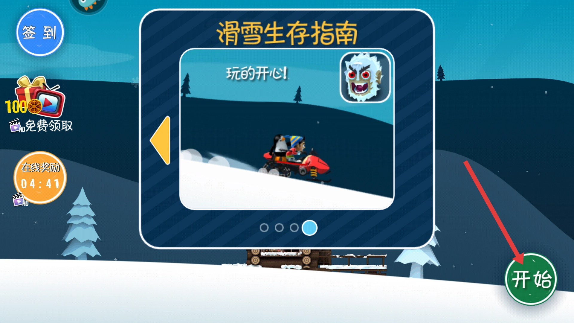 2、了解完滑雪的生存指南后,点击右下角【开始】按钮,开启滑雪冒险。