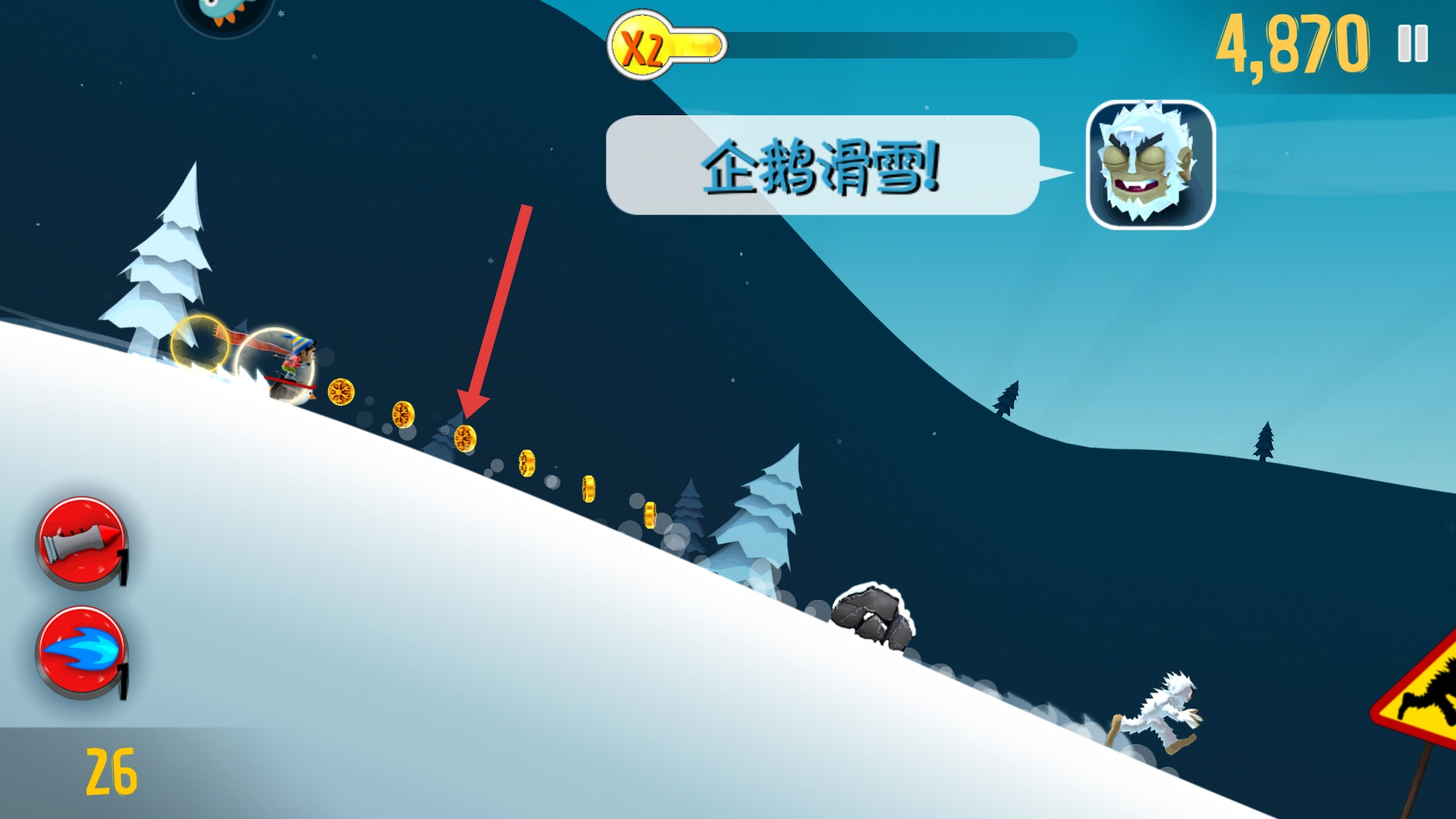 4、游戏中可拾取礼物等道具,获得积分奖励,同时利用道具提升滑雪体验,持续冒险获取更高分数。