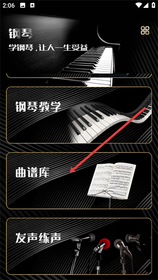 进入主界面后,点击【曲谱库】选项,即可进入曲谱资源浏览页面,在这里可以查找各类钢琴曲目对应的曲谱。