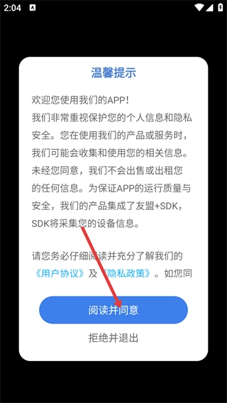 1、打开后,仔细阅读关于个人信息与隐私安全的温馨提示,以及《用户协议》和《隐私政策》,随后点击【阅读并同意】按钮。