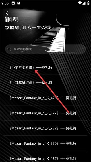 3、在曲谱库的曲目列表里,找到《小星变奏曲--莫扎特》并点击,即可进入该曲目的曲谱详情页面。