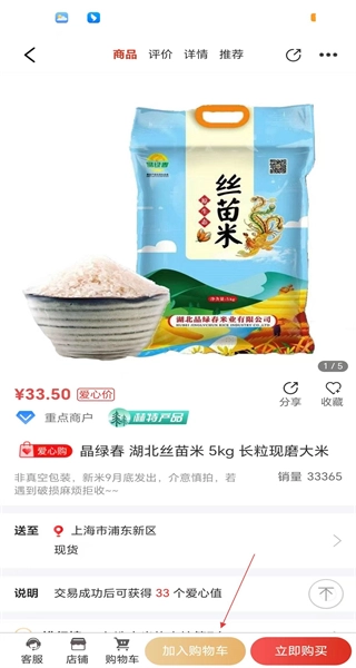 4、选择丝苗米进入详情页,查看价格配送及说明信息,找到加入购物车等操作按钮。