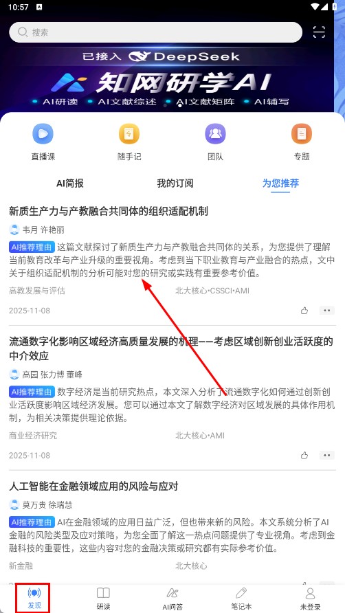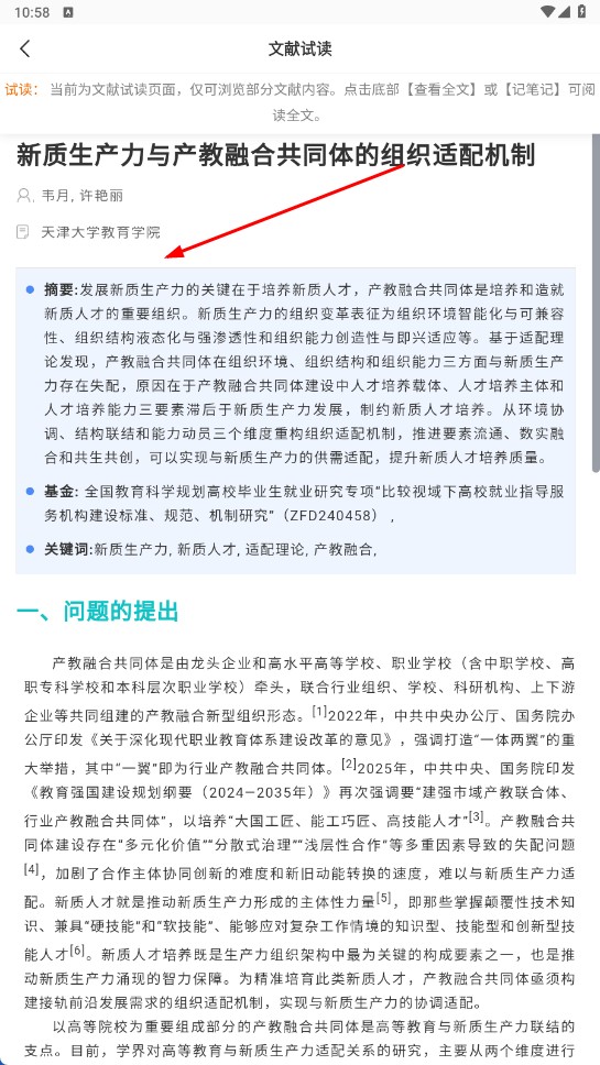 2、进入发现页面后,点击你感兴趣的文献条目,例如【新质生产力与产教融合共同体的组织适配机制-文献名称】这一类条目。