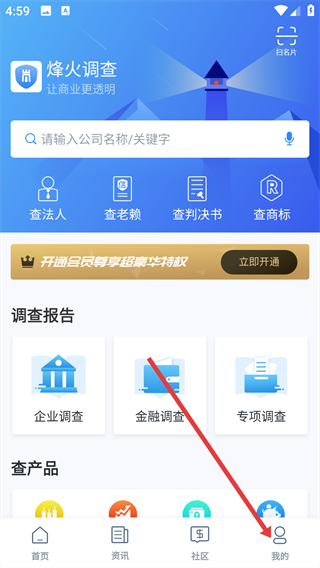 1、进入【烽火调查】页面后,顶部设有搜索框,底部可点击【我的】按钮,该页面包含【查法人】、【查老赖】、【查判决书】等功能入口。