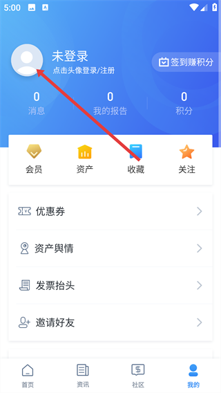 2、页面显示【未登录】状态,提示用户点击头像完成登录或注册操作,此外还设有【会员】【资产】【收藏】【关注】等功能选项。