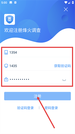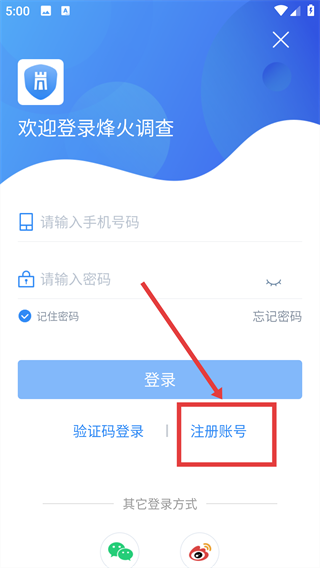 3、页面标题为【欢迎登录烽火调查】,设置【请输入手机号码】与【请输入密码】输入框,用户可点击【注册账号】按钮,也可选择【验证码登录】方式。