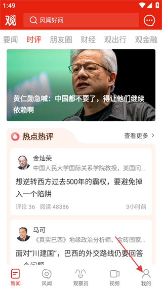 1、启动观察者网应用,找到页面右下角的“我的”按钮并点击,即可进入个人中心界面。