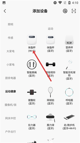 进入【添加设备】页面后,可在【照明】【运动】等分类下,选择【体脂秤(Wi-Fi)】【智能跳绳(蓝牙)】等对应设备进行添加。