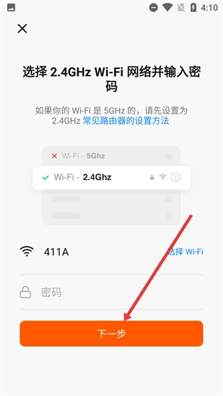 3、需选择【2.4GHz-Wi-Fi】网络(若当前为5GHz网络则需调整),选定网络后输入密码,随后点击橙色的【下一步】按钮以继续后续流程。
