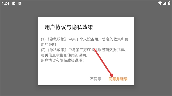 1、使用软件前需查看【用户协议与隐私政策】中关于个人设备用户信息收集使用,点击【同意并继续】方可继续使用。