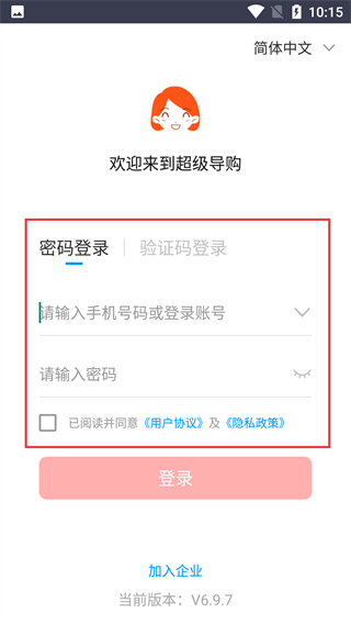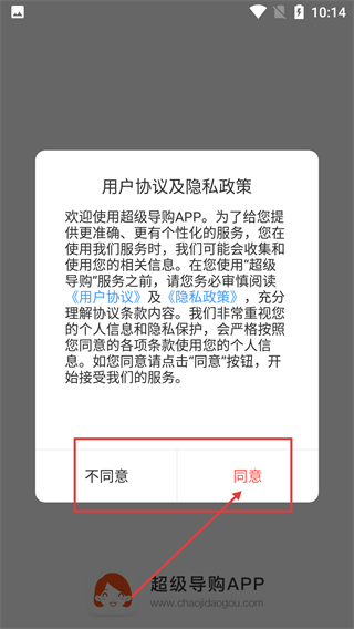1、进入后弹出【用户协议及隐私政策】弹窗,点击【同意】按钮以使用【超级导购】的服务。