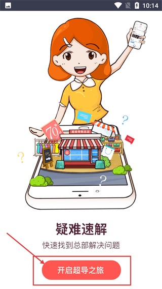 2、进入引导页,显示【疑难速解】提示,点击【开启超导之旅】按钮,即可进入【超级导购】的后续操作流程。