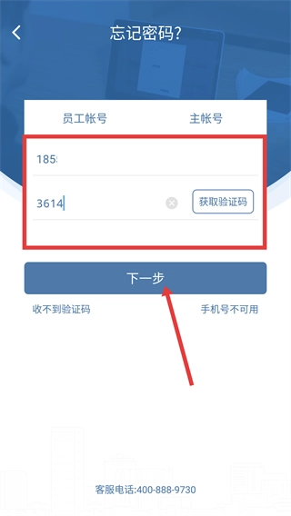3、在忘记密码页面,选【员工帐号】标签,填手机号帐号、获取并填验证码后,点【下一步】。