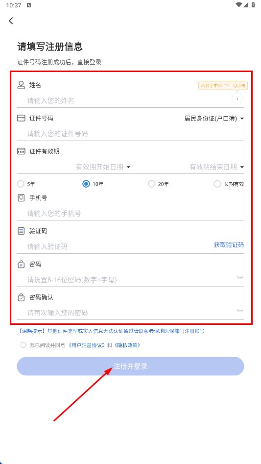 4、在注册页填写姓名、证件号码等信息后,点击【注册并登录-功能按钮】完成注册登录。