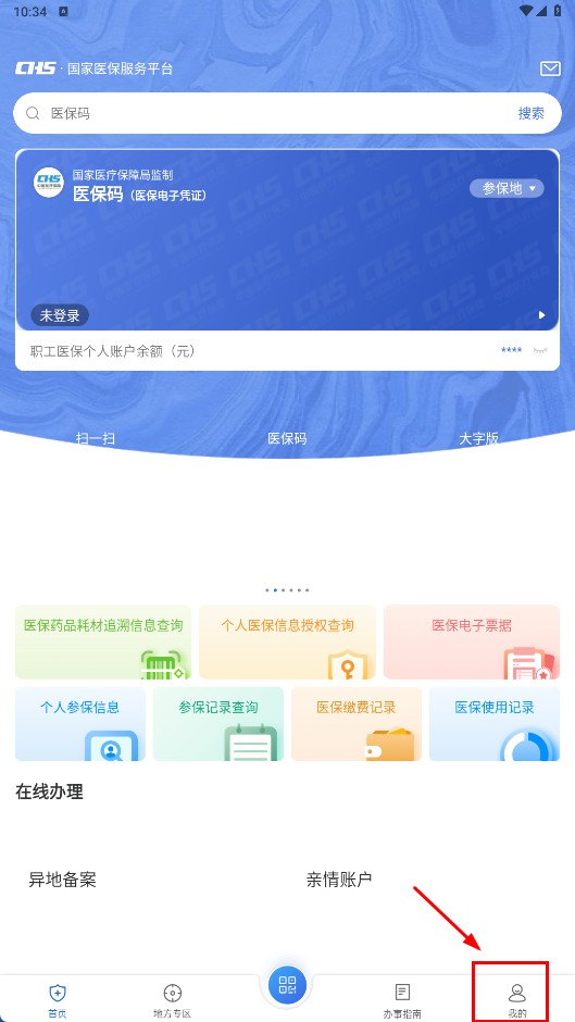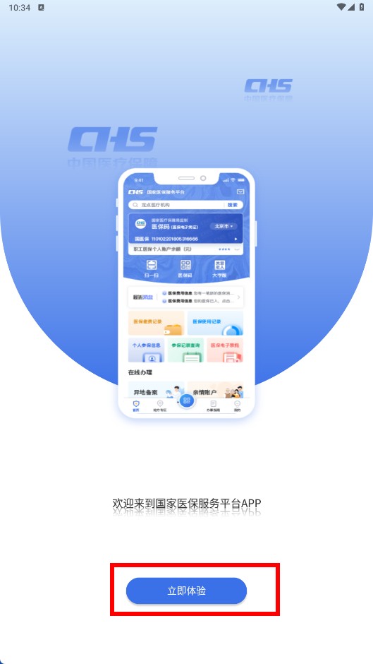 1、点击【立即体验-功能按钮】,进入国家医保服务平台主界面。